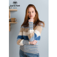 Een gestreepte trui die van boven naar beneden wordt gebreid met een dubbel gevouwen halslijn, zadelschouder en brede geribbelde strepen.