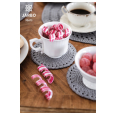 Een strak gehaakte onderzetter met gladde oppervlakte waarop glazen en mokken stevig staan. De onderzetter wordt gehaakt met vaste steken, waar de meerderingen uitgespreid worden zodat ze niet zichtbaar zijn, met een dekoratieve rand van samengehaakte stokjes. Creëer een beetje luxe in het dagelijkse leven en haak de onderzetters in 100% linnen of haak ze in Järbo 8/4, 100% katoen.