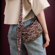 Een gemeleerd en meerkleurig gebreide tas mete en dubbelgebreide bodem en een aanpasbare schouderband die ervoor zorgt dat je hem kan dragen rond je lijf of over je schouder.