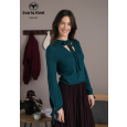 Blouse die in het rond gebreid wordt vanaf beneden naar boven. Vanaf de pas wordt de bloes heen en weer gebreid. Strikbanden versieren de hals en einde van de mouwen.